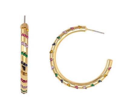 Яскраві сережки-кільця з різнобарвними фіанітами.